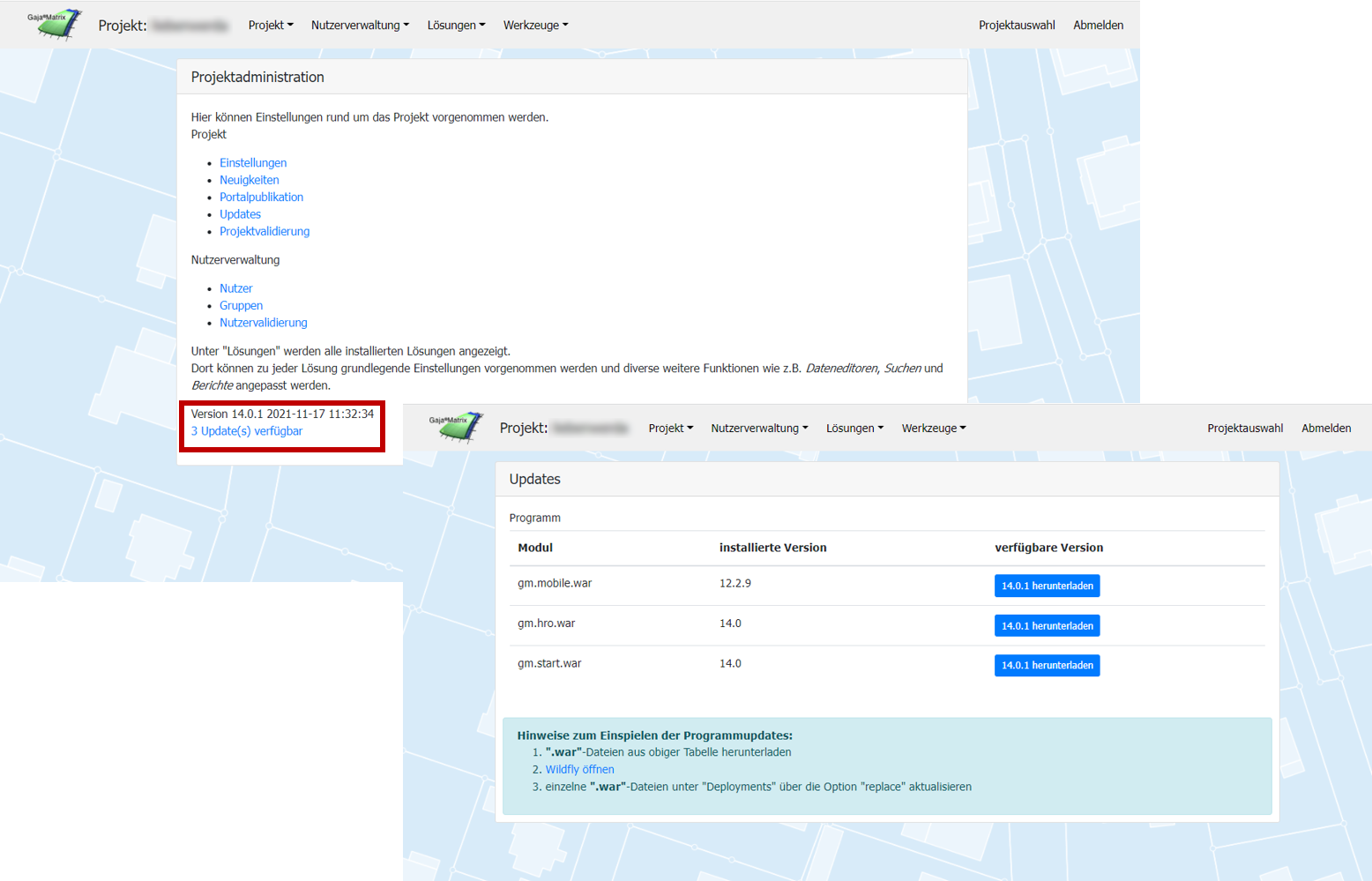Die Administration zeigt neue verfügbare Updates an. Neuere WAR-Dateien können direkt heruntergeladen werden.