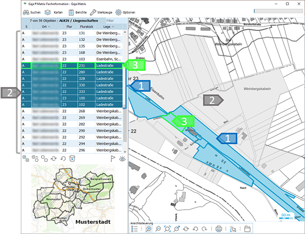 • 3: Flurstück unter Maus auf der Karte (grün)